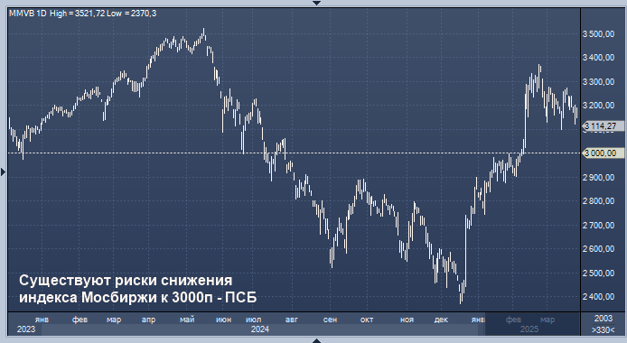Индекс Мосбиржи, возможно, будет торговаться в диапазоне 3100-3150 пунктов в четверг, однако существуют риски снижения к уровню 3000 пунктов, говорится в комментарии управляющего эксперта отдела экономического и отраслевого анализа Промсвязьбанка (ПСБ) Екатерины Крыловой.