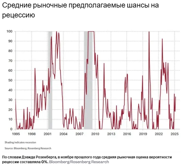 По мнению Дэвида Розенберга, экономиста и президента Rosenberg Research, вероятность рецессии в различных секторах и классах активов выросла до 33% на прошлой неделе по сравнению с 0% в ноябре.