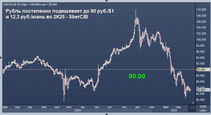 Рубль постепенно подешевеет до 90 руб./$1 и 12,3 руб./юань во 2 квартале 2025 года, говорится в комментарии аналитиков SberCIB Investment Research.