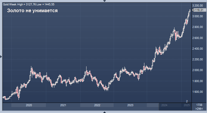 Стоимость золота на спотовом рынке выросла на 1,1% до 3116,82 доллара за унцию по состоянию на 06:38 по московскому времени. Ранее был достигнут рекордный максимум в 3128,06 доллара. Американские фьючерсы на золото также выросли на 1,1% до 3148 долларов.