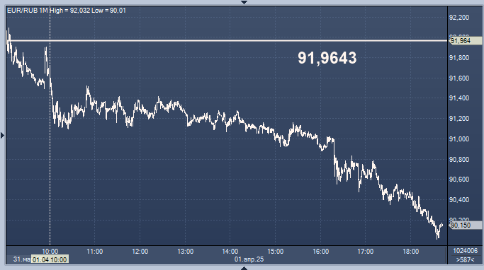 - 91,9643 рубля за 1 евро