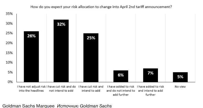 Как, по вашему мнению, изменится распределение рисков после объявления тарифов 2 апреля?Я не включил риск в новости. Я сократил риск и не собираюсь его увеличивать. Я сократил риск и намерен добавить. Я увеличил риск и не собираюсь увеличивать его дальше. Я увеличил риск и намерен увеличить его еще больше. Goldman Sachs Marquee Источник: Goldman Sachs.