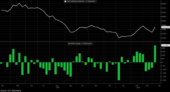 Запасы в Кушинге, где производится поставка по фьючерсам на нефть WTI, подскочили на 2,373 млн баррелей до 25,078 млн баррелей (см. график выше). Это — рекордные значения с января 2023 года и февраля текущего года соответственно.