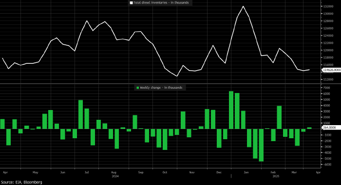 Запасы дизеля и бензина показали незначительные изменения: первые прибавили 264 тыс. баррелей (первое увеличение запасов с февраля):