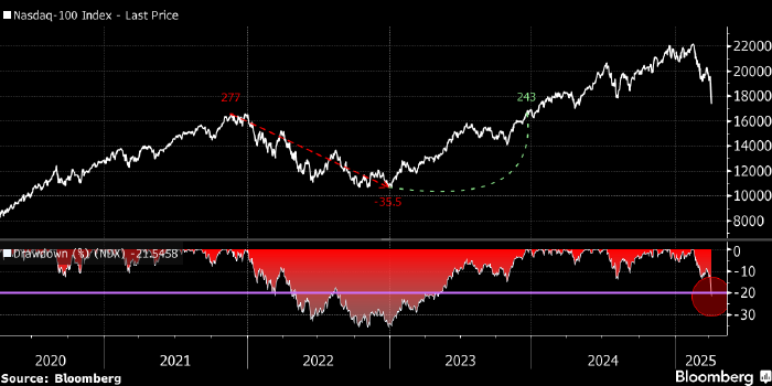 Вверху: Nasdaq 100, внизу — процентное снижение индекса с предыдущего максимума. Источник: Bloomberg
