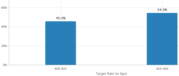 Тем не менее вероятность сохранения ставки на уровне 4,25–4,50% все еще оценивается выше — в 54,5%.
