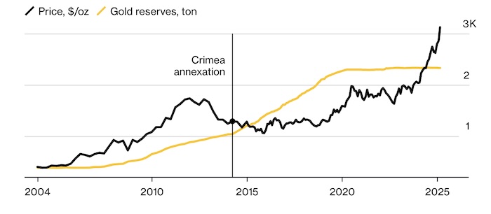 Центральный банк начал скупать золото в 2014 году, после присоединения Крыма, которое на Западе сочли незаконным. Между 2014 и 2020 годами, когда цена золота колебалась от примерно 1 100 до 1 500 долларов за унцию, он увеличил свои резервы драгоценного металла на 40 миллионов унций.
