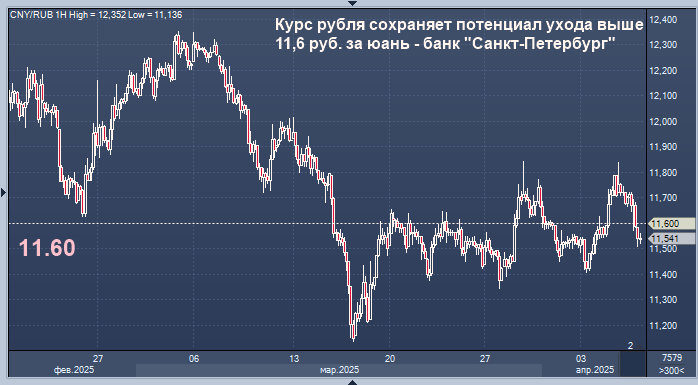 Курс валютной пары юань/рубль сохраняет потенциал возврата выше уровня 11,6 руб. за юань по мере исчерпания временной поддержки со стороны выросшего предложения валюты ЦБ РФ, говорится в комментарии аналитиков банка "Санкт-Петербург".