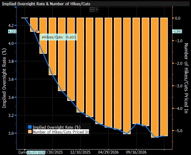 Синяя линия на диаграмме — вмененная или ожидаемая ставка. Желтые столбцы гистограммы — количество снижений ставки с шагом в 25 б.п. Гистограмма отражает котировки фьючерсов на ставку по федеральным фондам и отражает, что вероятность майского снижения чуть выше 60%. При этом рынок на 100% уверен, что до конца 2025 г. ставка с шагом 0,25% будет снижена не менее 4-х раз.