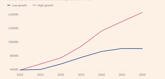 Но даже это, вероятно, является заниженной оценкой, поскольку учитываются только правительственные политики и данные до начала 2023 года — до недавнего роста интереса среди компаний и властей. Представители отрасли предупреждают, что спрос на уран стремительно растет, а западные энергетические компании рискуют столкнуться с дефицитом.