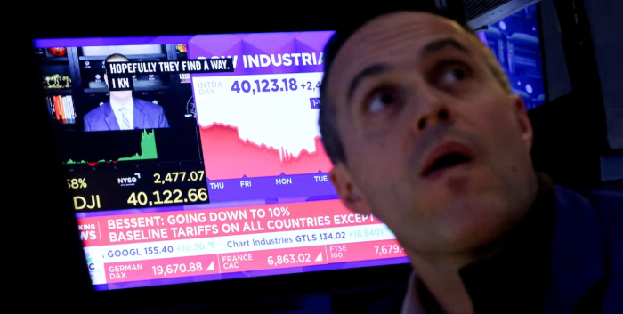 Трейдер в зале Нью-Йоркской фондовой биржи (NYSE) в Нью-Йорке после того, как Белый дом объявил о 90-дневной паузе в применении взаимных пошлин для других стран, США, 9 апреля 2025 г. REUTERS