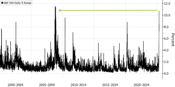 Когда фондовый рынок стабилизировался в среду, Трамп высказался, заявив, что это «ОТЛИЧНОЕ ВРЕМЯ ДЛЯ ПОКУПКИ!!!», что, по-видимому, было его самым сильным признаком беспокойства о крахе фондового рынка, вызванном его торговой войной, и, возможно, прелюдией к тому, что должно было произойти. Затем, чуть позже 13:00, когда Белый дом объявил, что он призывает к временной остановке многих тарифов, которые только что вступили в силу, волны эйфории вызвали еще один резкий разворот.