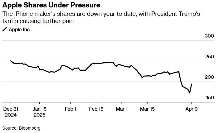 Акции Apple под давлением. Акции производителя iPhone с начала года упали, а тарифы президента Трампа нанесли еще больший урон. Источник: Bloomberg