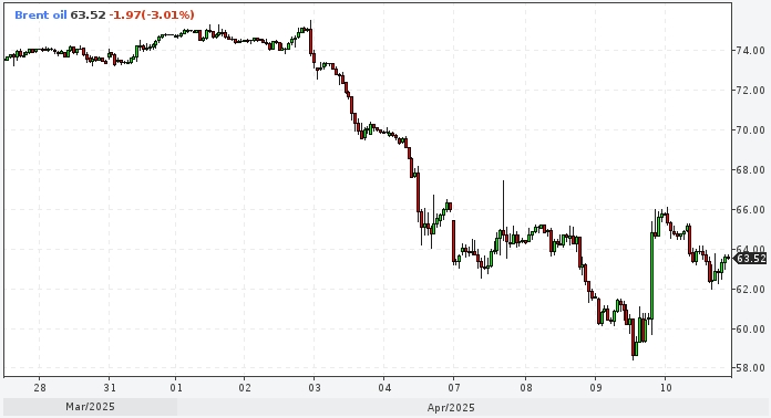 В четверг вечером, 10 апреля, нефть Brent, которая накануне попыталась вернуться выше $65 за баррель, теряла в цене около 3%, снижаясь до $63,6 за баррель.