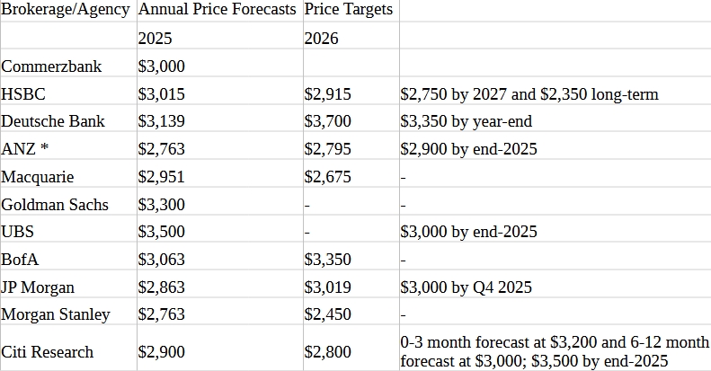 Вот список последних прогнозов стоимости золота на 2025 и 2026 годы (в долларах за унцию):