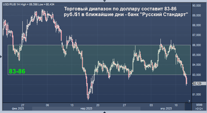 Торговый диапазон по доллару, скорее всего, составит в ближайшие дни 83-86 руб./$1, по евро - 95-98 руб./EUR1, полагает директор департамента операций на финансовых рынках банка "Русский Стандарт" Максим Тимошенко.