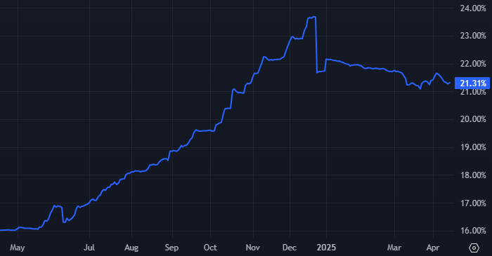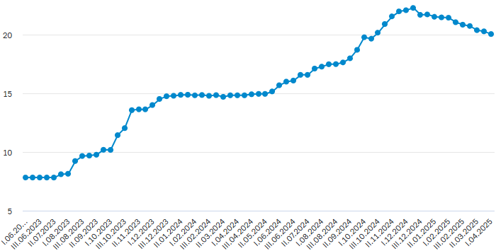 В первой декаде апреля максимальная процентная ставка (по вкладам в российских рублях) десяти кредитных организаций, привлекающих наибольший объём депозитов физических лиц, опустилась до 20,05%. Это — самое низкое значение со второй декады октября, следует из опубликованных сегодня Банком России данных.