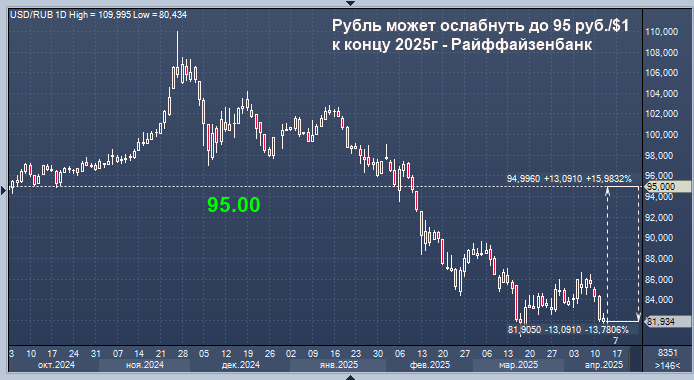 Рубль может ослабнуть по отношению к доллару до уровня 95 руб./$1 к концу текущего года, считают аналитики Райффайзенбанка.