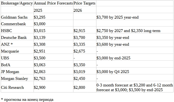 Ниже приведен список последних прогнозов цен на золото на 2025 и 2026 годы (в долларах за унцию):