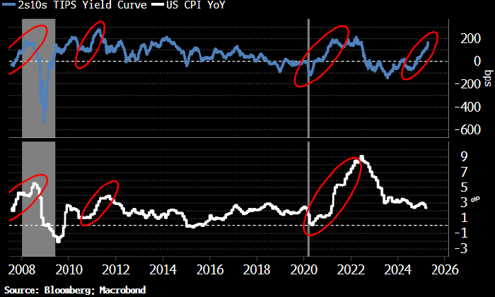 Вверху: спред доходности между 2- и 10-летними TIPS (в б.п.), внизу: Индекс потребительской инфляции в США (в % г/г). Источник: Bloomberg