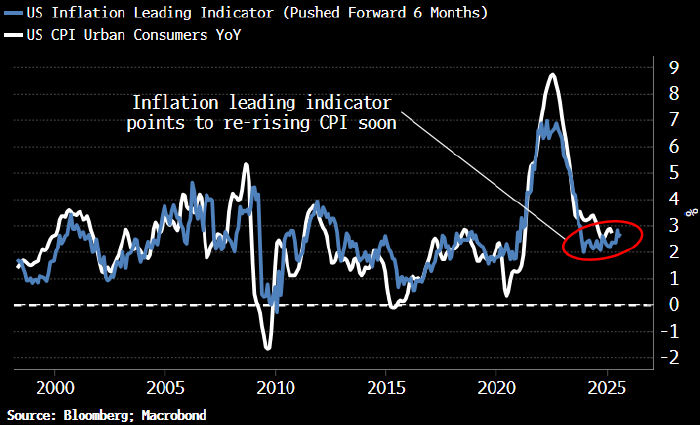 Голубым — опережающий инфляционный индикатор для США, смещенный вперед на 6 месяцев, белым — официальный ИПЦ (в % г/г). Источник: Bloomberg