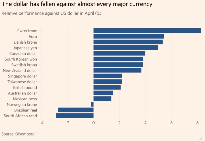 Примечательно, что доллар особенно сильно ослаб по отношению к другим «валютам-убежищам», которые обычно укрепляются во время нестабильности на рынках, таким как швейцарский франк и японская иена, а также по отношению к золоту. То, что доллар, по-видимому, исключают из этого избранного клуба валют, шокирует многих аналитиков и инвесторов.