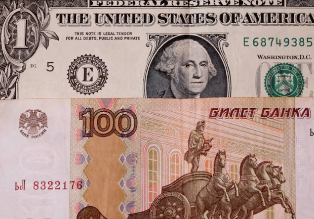 Вид на однодолларовую американскую и 100-рублевую российскую банкноты на этой иллюстрации, сделанной 14 августа 2023 года. REUTERS/Shamil Zhumatov/Illustration