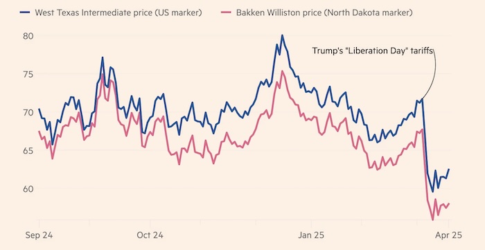 Тарифная риторика Трампа спровоцировала распродажу нефти — американские цены упали ниже $60 за баррель (нефть West Texas закрылась на уровне $63,08 за баррель в понедельник). Эскалация напугала весь сланцевый пояс США, один из самых «красных» (республиканских) регионов Америки, усилив страхи надвигающегося замедления.