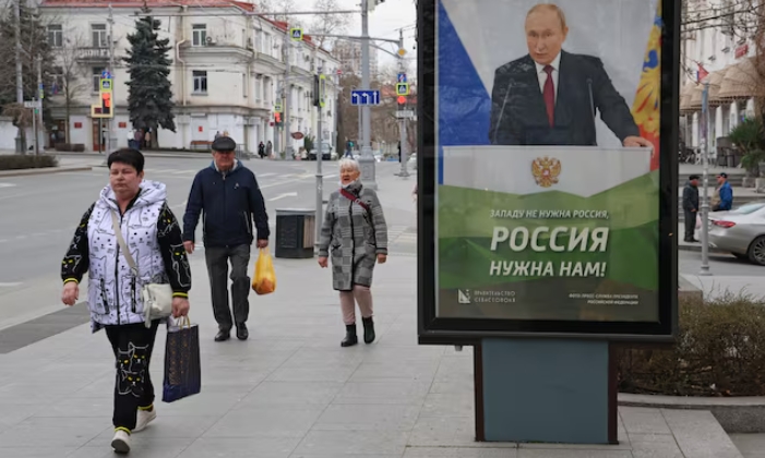 На фото: баннер с изображением президента России Владимира Путина в Севастополе, Крым, 22 марта 2025 г. REUTERS