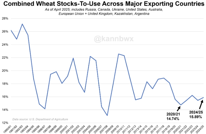 Два месяца назад Министерство сельского хозяйства США прогнозировало, что в 2024–2025 годах мировые запасы пшеницы к потреблению среди основных стран-экспортёров составят 17-летний минимум в 14,56%.
