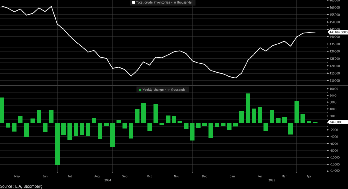 По данным Минэнерго США, на неделе до 18 апреля коммерческие запасы сырой нефти в стране выросли на 0,244 млн баррелей до самого высокого уровня с июля 2024 года.