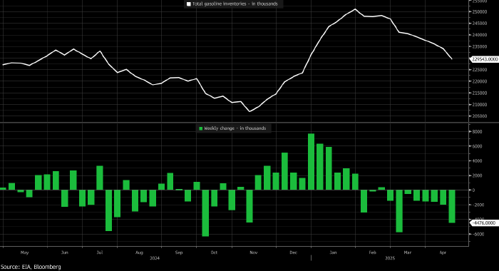 Запасы бензина снижаются уже восемь недель подряд: на этот раз они сократились на 4,476 млн баррелей до самого низкого уровня с декабря 2024 года.