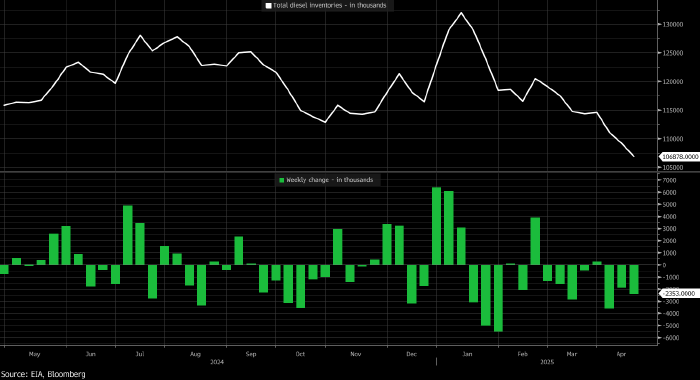 Запасы дистиллятов снизились на 2,353 млн баррелей до самого низкого уровня с ноября 2023 года.
