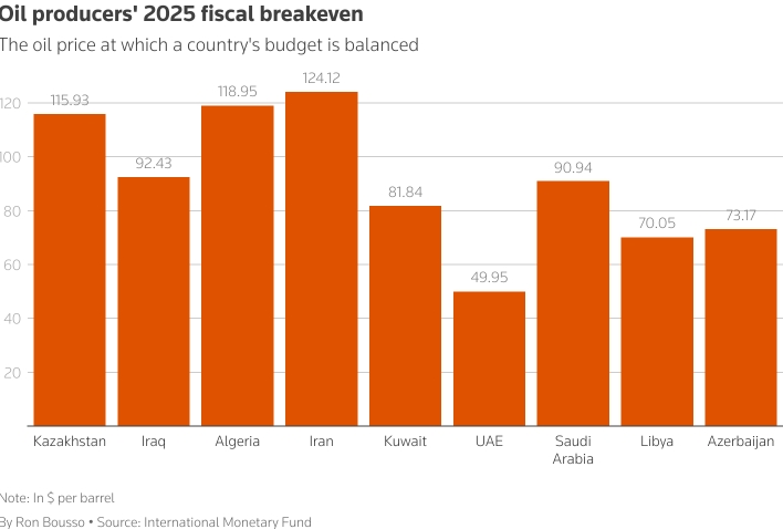 Финансовая безубыточность производителей нефти в 2025 году. Цена на нефть, при которой бюджет страны сбалансирован. Примечание: В долларах за баррель. Рон Буссо. Источник: Международный валютный фонд