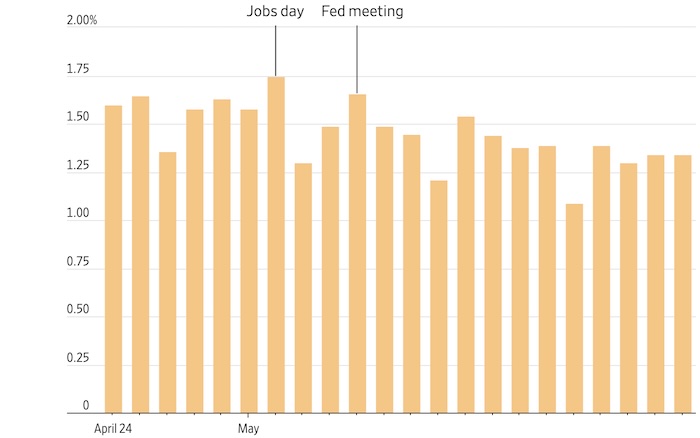Тем не менее, трейдеры на рынке опционов делают ставку на движение в 1% или более, вверх или вниз, в индексе S&P 500 для каждой сессии по крайней мере до 23 мая. Об этом говорится в записке стратегов Citigroup. Ожидается, что эти движения будут сильнее в дни важных экономических событий: опционы оценивают колебание в 1,8% в день публикации отчета о занятости за апрель и движение в 1,7% в день пресс-конференции Пауэлла после майского заседания.