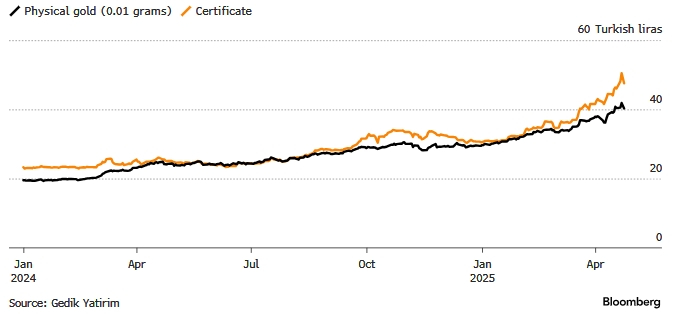 Золотые сертификаты, торгуемые на бирже Borsa Istanbul, теоретически должны следовать цене 0,01 грамма физического слитка, который они представляют, но на этой неделе они выросли до рекордной премии в 21%, согласно данным брокерской компании Gedik Yatirim. Разрыв в стоимости обусловлен всплеском интереса инвесторов с начала марта, поскольку напряженность в мировой торговле приводит к росту цен на золото, считает аналитик Бурак Пирланта из Gedik Yatirim.