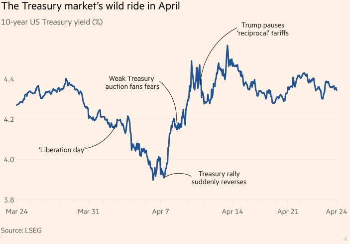 Бурный рост рынка казначейских облигаций в апреле. Доходность 10-летних казначейских облигаций США (%). Трамп приостанавливает «взаимные» тарифы. Опасения поклонников слабого аукциона казначейских облигаций. «День освобождения». Ралли казначейских бумаг внезапно сменилось падением. Источник: LSEG