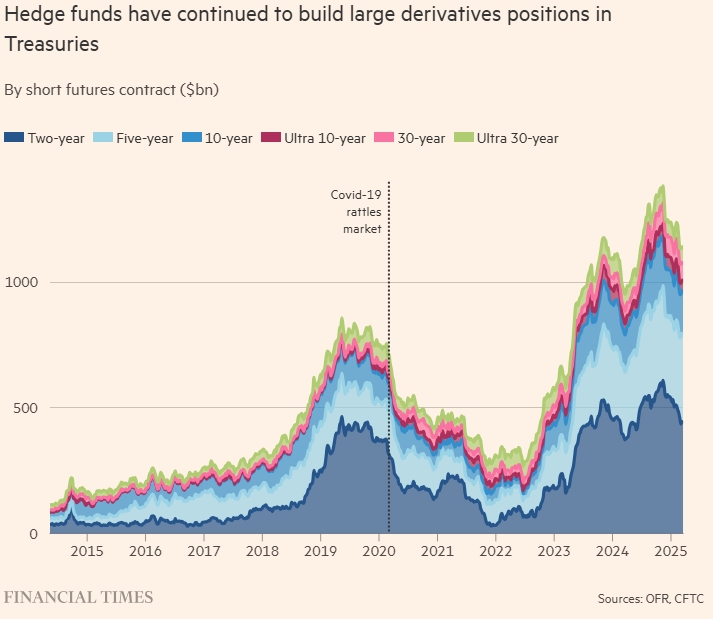 Это означало бы, что эти стратегии теперь удерживают почти столько же государственного долга США, сколько центральный банк Японии, крупнейший зарубежный держатель, и больше, чем официальные активы Китая. Поскольку иностранные инвесторы уже нервничают из-за администрации Трампа, это означает, что здоровье казначейского рынка может оказаться в заложниках у тех самых сделок, которые иногда вызывают у него перебои в работе.