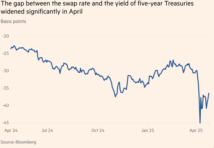 Однако, когда волатильность на рынке государственных облигаций резко возросла после «дня освобождения» Трампа, сделки были срочно отменены, что привело к ещё большему снижению спреда между государственными облигациями и свопами.