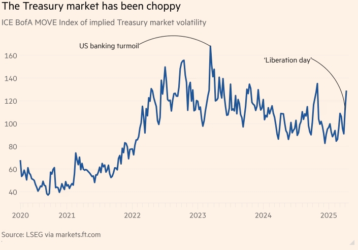 Рынок казначейских облигаций был нестабильным. Индекс ICE BofA MOVE подразумеваемой волатильности рынка казначейских облигаций. Банковский кризис в США. «День освобождения». Источник: LSEG через markets.ft.com