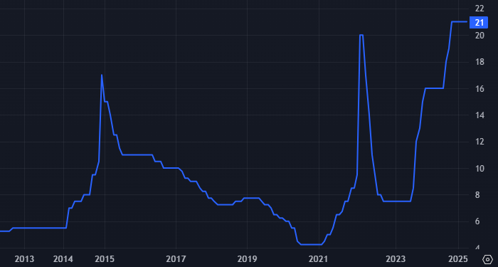 Пятничное решение Банка России оставить ключевую ставку на уровне 21% обусловлено неопределенностью относительно влияния тарифов Трампа на рынки. Кроме того, регулятор стремится восстановить свою репутацию, т. к. инфляция в стране превышает целевой уровень 4% уже пять лет.