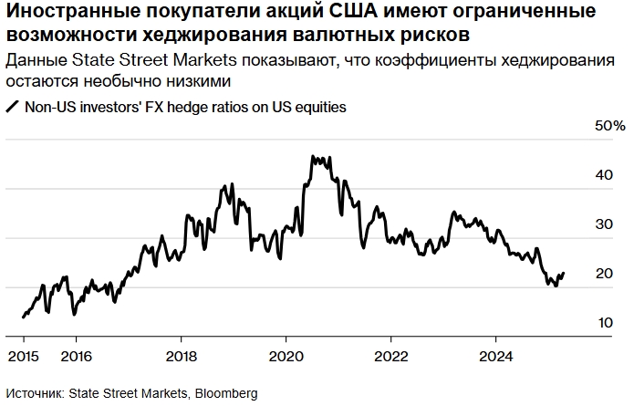 Хезез, как и многие инвесторы, ранее считал, что нет смысла компенсировать валютный риск. Идея заключалась в том, что если американские акции будут распроданы из-за глобальной паники, доллар, скорее всего, укрепится из-за спроса на убежище и компенсирует эти потери. Общий уровень валютного хеджирования иностранных инвесторов в американские акции составляет 23%, что значительно ниже почти 50%-ного уровня, наблюдавшегося в 2020 году, показывают данные State Street Corp.