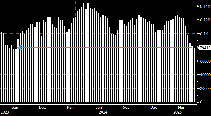 На неделе до 25 апреля крупные спекулянты сократили чистую длинную позицию во фьючерсах на алюминий на LME до 79,412 тыс. контрактов, следует их опубликованных сегодня биржевых данных. Это — самое низкое значение за 19 месяцев и почти на 20% ниже среднеисторического показателя за все время ведения подобной статистики, начиная с января 2018 года.