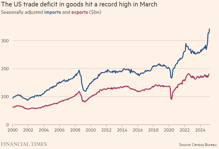 Согласно официальным данным, в прошлом месяце разрыв между импортом и экспортом составил 162 миллиарда долларов. Это самый высокий показатель с 1990-х годов, что значительно превышает показатель 2024 года (92,8 миллиарда долларов).
