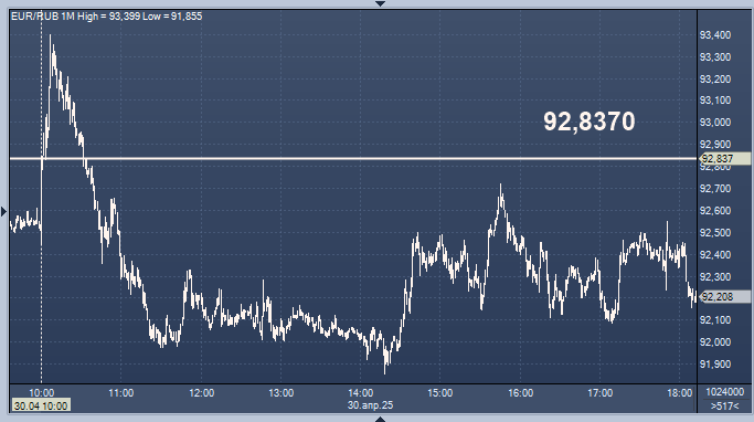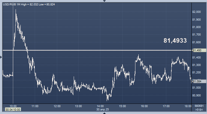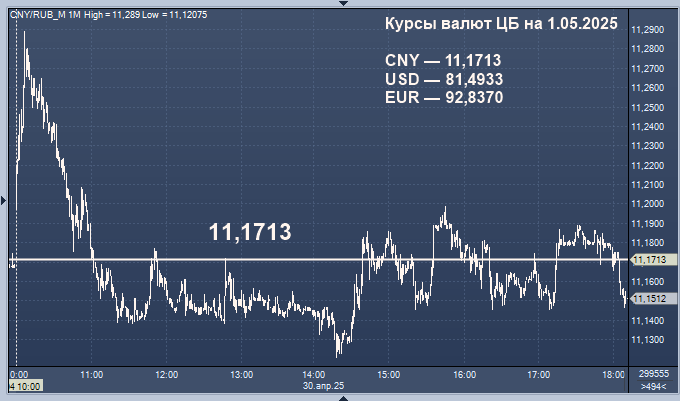 Китайский юань немного повышается на Московской бирже днем в среду. Рубль слабо опускается в ходе неактивных торгов перед майскими праздничными выходными, пишет Интерфакс. Торги долларом и евро не проводятся на Московской бирже с 13 июня 2024 года из-за санкций. В связи с этим наиболее подходящими ориентирами колебаний курса (в том числе для внебиржевого рынка) являются котировки однодневного фьючерсного контракта с автопролонгацией на курс "доллар США - российский рубль" (USDRUBF) и такого же контракта на курс "евро - российский рубль" (EURRUBF).