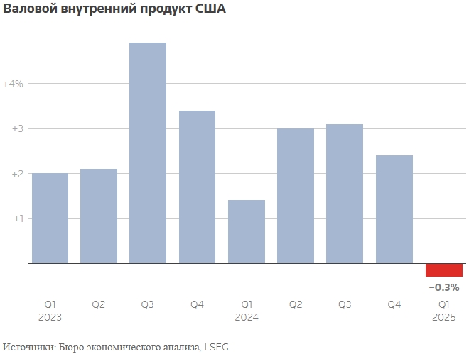 Экономика США сократилась на 0,3% в годовом исчислении в 1 квартале 2025 года, сообщило 30 июня Бюро экономического анализа Министерства торговли, поскольку американские предприятия бросились покупать импортные товары перед шквалом тарифов от президента Дональда Трампа. Рост потребительских расходов замедлился до 1,8% с 4% в предыдущем квартале.