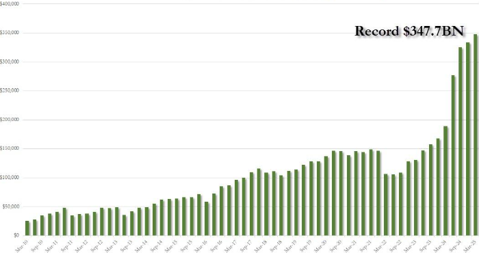 Интересно, что по состоянию на 31 марта объем наличных на балансе Berkshire Hathaway составлял $347,7 млрд (см. график ниже), что является новым рекордным значением. Это означает, что Баффетт все еще не видит новых интересных возможностей на рынке акций США.