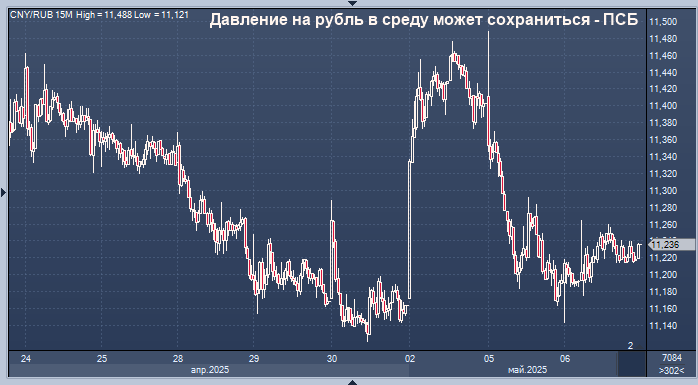 "По итогам торгов вторника российский рубль умеренно снизился по отношению к основным мировым валютам. В среду на старте торгов ожидаем сохранения давления на национальную валюту, - пишет аналитик в комментарии. - Так, в преддверии длинных выходных часть инвесторов может перейти к покупкам валюты для усиления диверсификации портфеля и защиты его от рисков ослабления рубля. В сложившейся ситуации ожидаем, что в ходе сессии пара юань/рубль продолжит движение в диапазоне 11-11,5 рубля и попытается перейти в его верхнюю половину. При этом на горизонте до конца мая видим риски выхода китайской валюты вверх из данного коридора".