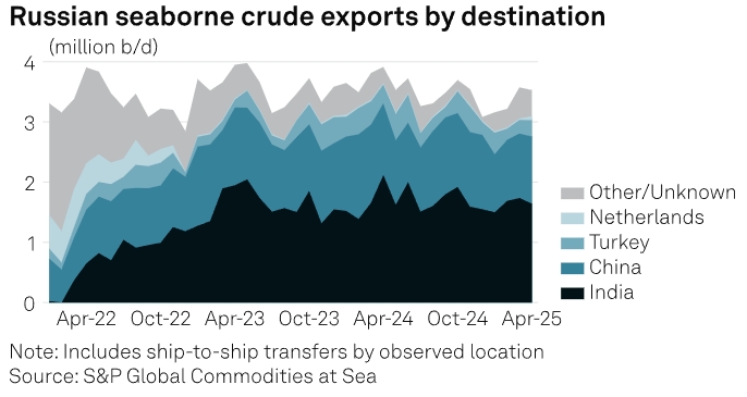 Это произошло после того, как Россия отгрузила 1,64 млн б/с в Индию (крупнейший покупатель нефти РФ). Объем поставок все еще высок, но ниже показателя в 1,74 млн б/с в марте, поскольку нефтеперерабатывающие заводы в этой южноазиатской стране импортировали больше баррелей из США на фоне обострения торговой напряженности.