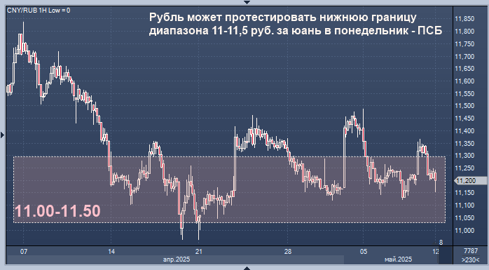 Пара юань/рубль, вероятно, продолжит консолидацию в диапазоне 11-11,5 руб. в понедельник утром, при этом в ходе торговой сессии возможны попытки тестирования его нижней границы, прогнозирует управляющий по анализу банковского и финансового рынков банка ПСБ Богдан Зварич.